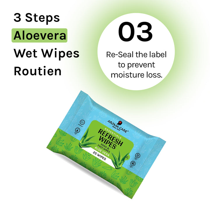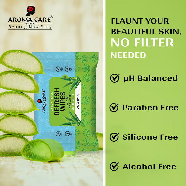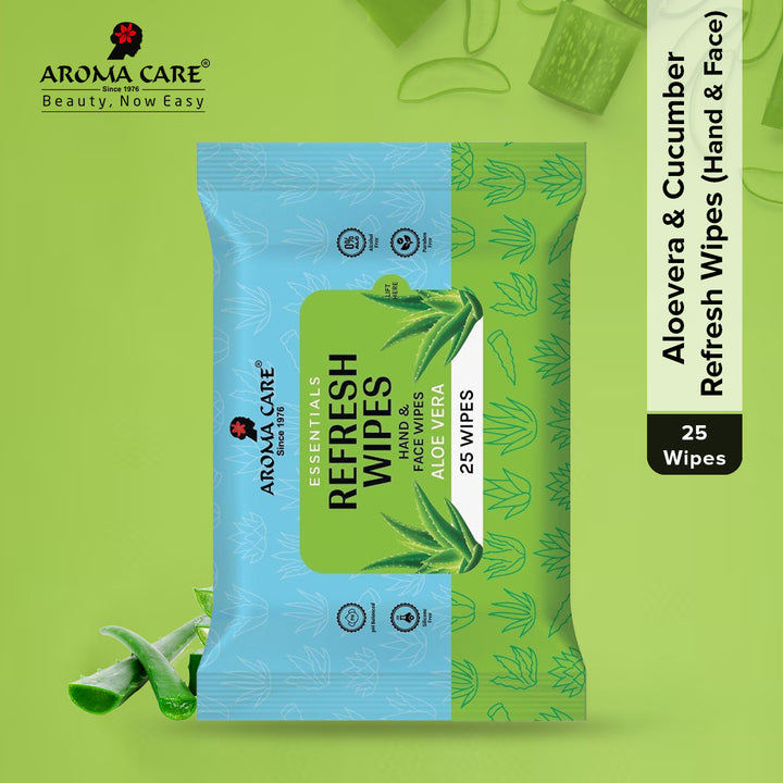 Soothe, hydrate, and refresh your skin naturally with Aroma Care Essentials Aloe Vera & Cucumber Refresh Wipes — the perfect companion for instant cooling and deep hydration on the go. Infused with the natural goodness of Aloe Vera and Cucumber extracts, these refreshing wet wipes gently remove dirt, oil, and impurities, leaving your skin feeling cool, clean, and nourished.